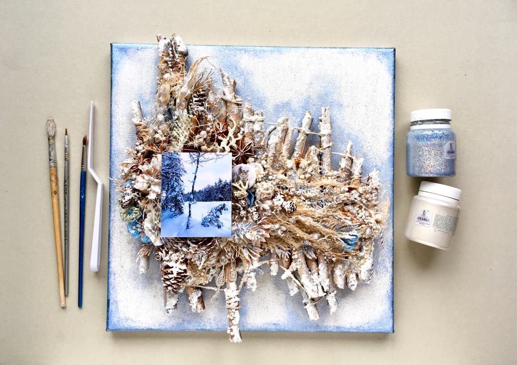 С этой целью я оформила холст 30 на 30 см, разместив на нём композицию из природных материалов: основа - собранные в лесу веточки, которую дополняют ольховые и лиственные шишки, а также пучок зелёного древесного мха, деревянные спилы, кора сосны и пряности! Сам холст покрашен акриловыми красками от любимого Люксарт. Первая краска-"огонь" с названием LuxPearl Голографический серебро перламутровый и неповторимым блеском морозного снега (баночка уже более чем наполовину пуста!), вторая краска - LuxPearl ультрамарин перламутровый - это невероятный оттенок морозного солнечного дня! Эти же две краски участвуют и в оформлении деревянной основы, собранной из веток. Кроме них использовала ещё несколько люксартовских акриловых металликов коричневых и золотых оттенков. Не обошлось и без чудесного жемчуга, который представляет краска LuxPearl белый перламутровый. Закрепляла все слои и топпинги, как обычно, гелем LuxGel прозрачный.